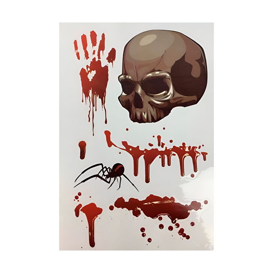Adesivo decorativo de Halloween com caveira e sangue, versátil e fácil de aplicar, ideal para decoração de festas, convites, janelas, portas e fantasias.