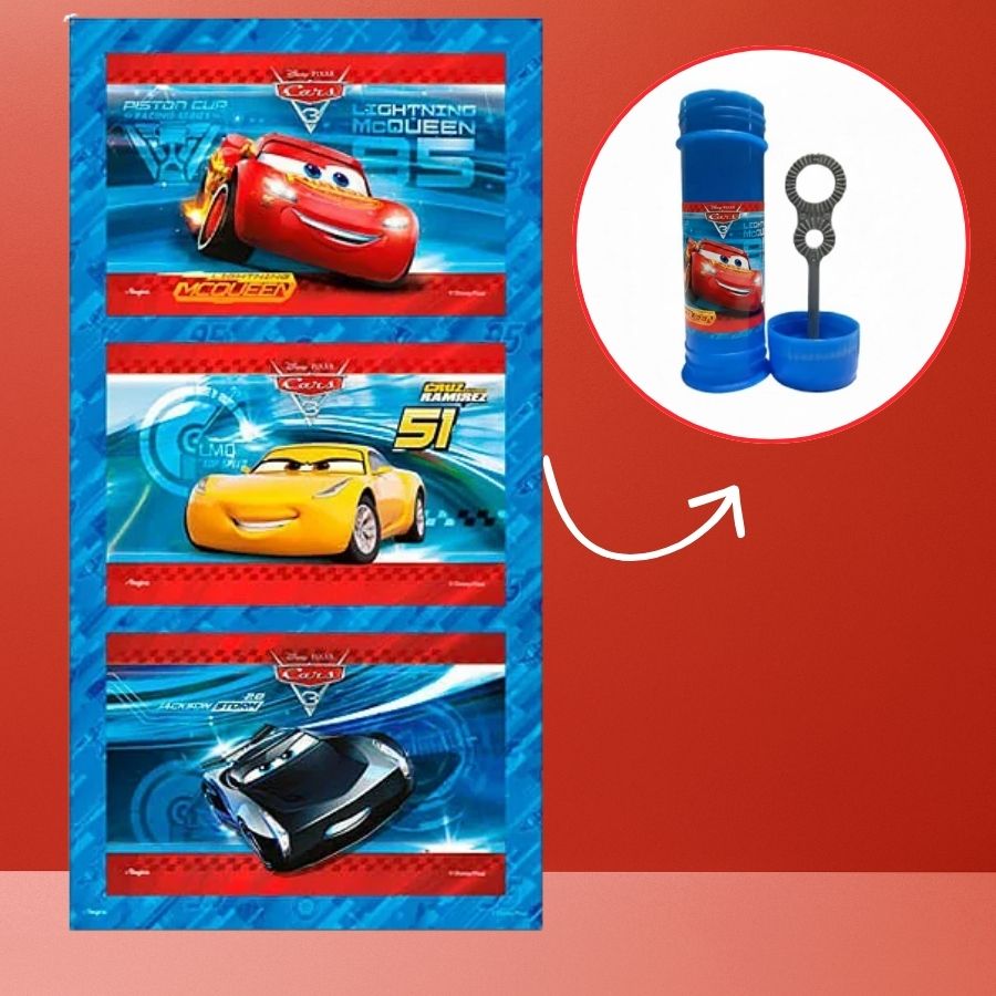 Além da estética, o Adesivo Decorativo para Bolha de Sabão inspirado no Carros Disney oferece praticidade na personalização das lembrancinhas. O conjunto conta com 3 cartelas, cada uma com 3 adesivos, totalizando 9 unidades, facilitando a organização e a montagem dos kits de festa. Ideal para decorar frascos de bolha de sabão e outros itens lisos, o produto é uma opção criativa para enriquecer a decoração. Bolha de sabão não inclusa. Foto ilustrativa.