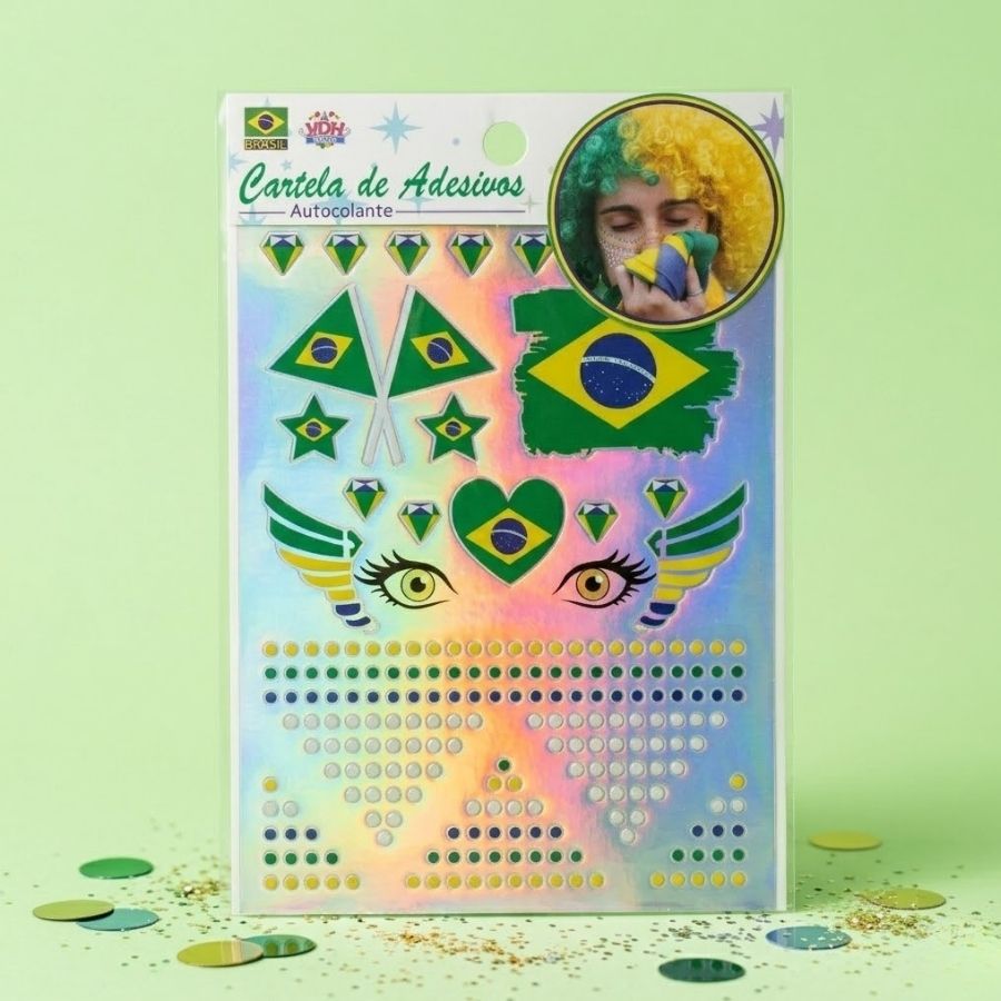 É o acessório ideal para quem quer demonstrar sua torcida com estilo, praticidade e personalidade. Desenvolvido com material leve e confortável, esse adesivo facial copa do mundo possui aplicação simples e rápida, dispensando o uso de cola adicional. Com excelente fixação, ele garante um visual marcante e moderno, sendo perfeito para compor produções criativas com as cores da torcida. Um acessório de torcedor indispensável para quem busca destaque em qualquer evento esportivo. Versátil e fácil de usar, o adesivo facial autocolante pode ser aplicado em diferentes regiões do rosto, como bochechas, testa e ao redor dos olhos. Ideal para festas da copa, jogos, encontros com amigos, bares, fan fests e até gravação de vídeos e fotos temáticas. Combine com maquiagem verde e amarela, glitter, camisetas da seleção e outros acessórios para um look completo e cheio de energia. Também é uma ótima opção para fantasias copa do mundo e produções criativas de torcida.