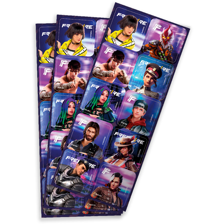 Um pacote com 3 cartelas tendo 10 adesivos quadrados em cada com o tema Free Fire