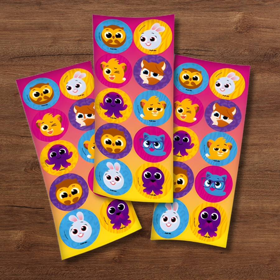 O Adesivo Redondo Bolofofos mede 4x4cm e é produzido em material adesivo resistente, com impressão colorida e excelente fixação. Ideal para lembrancinhas, convites e decorações de festas infantis, proporcionando praticidade e um toque encantador à ambientação temática.