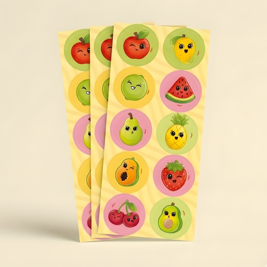 Adesivo em formato redondo com estampa de frutinhas, medindo aproximadamente 4x4cm. Indicado para uso decorativo em embalagens, lembrancinhas e superfícies diversas. Produto de uso simples e prático. Pode apresentar variações de tonalidade na impressão. Recomenda-se aplicar em superfícies limpas e secas para melhor fixação.