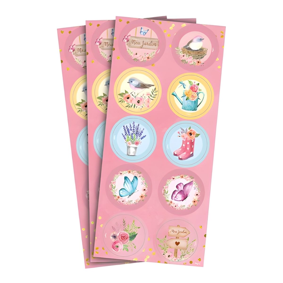 O Adesivo Redondo - Meu Jardim - 4x4cm é uma opção delicada e encantadora para personalizar lembrancinhas, embalagens e convites com o tema natureza. O conjunto vem com 30 adesivos, divididos em 3 cartelas com 10 unidades cada, todos estampados com elementos fofos como borboletas, passarinhos, flores e folhagens, perfeitos para compor uma decoração leve e alegre.