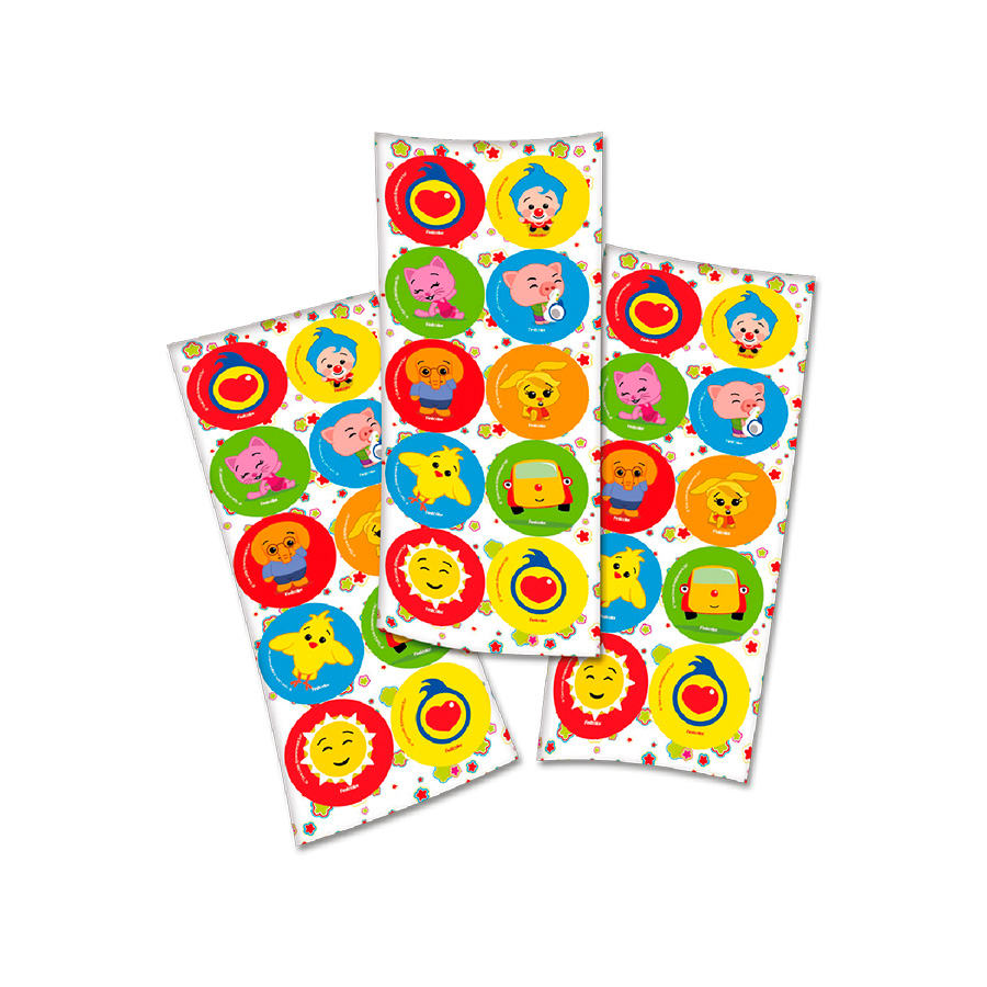 Um pacote com 3 cartelas tendo 10 adesivos redondos em cada com o tema Plim Plim, um herói do coração