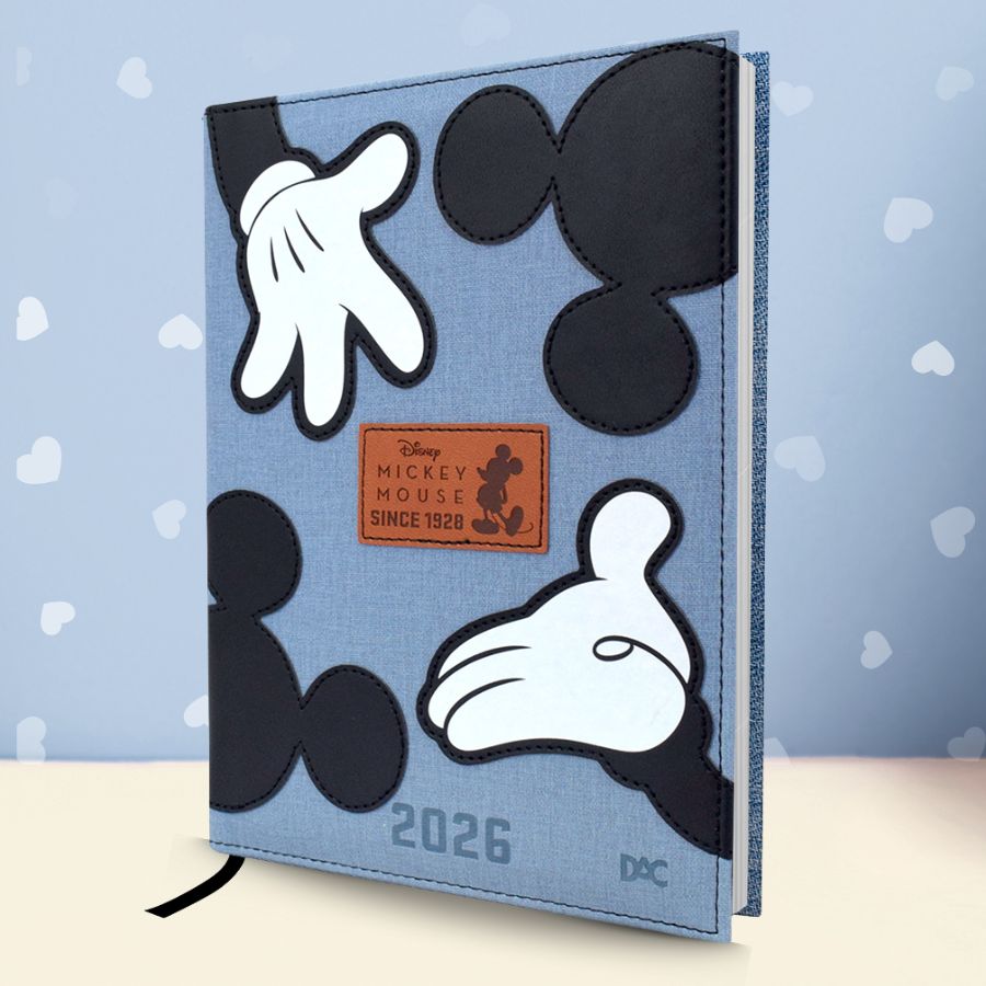 A capa apresenta textura semelhante a jeans, criando um visual moderno e diferenciado, além de apliques em material sintético semelhante a couro, cuidadosamente costurados, que valorizam o design e trazem um toque sofisticado. A composição une funcionalidade e estética, tornando esta agenda uma escolha certeira para quem busca organização com identidade visual marcante. Disponível na Loja Disney, trata-se de um Produto Original Disney, ideal para fãs do Mickey Mouse Disney que desejam planejar o ano com criatividade.