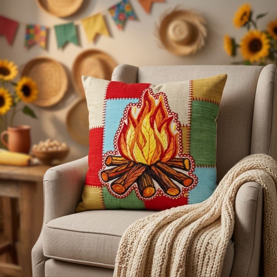 Almofada decorativa junina com estampa de fogueira, 43 cm, ideal para deixar o ambiente aconchegante, temático e cheio de charme.