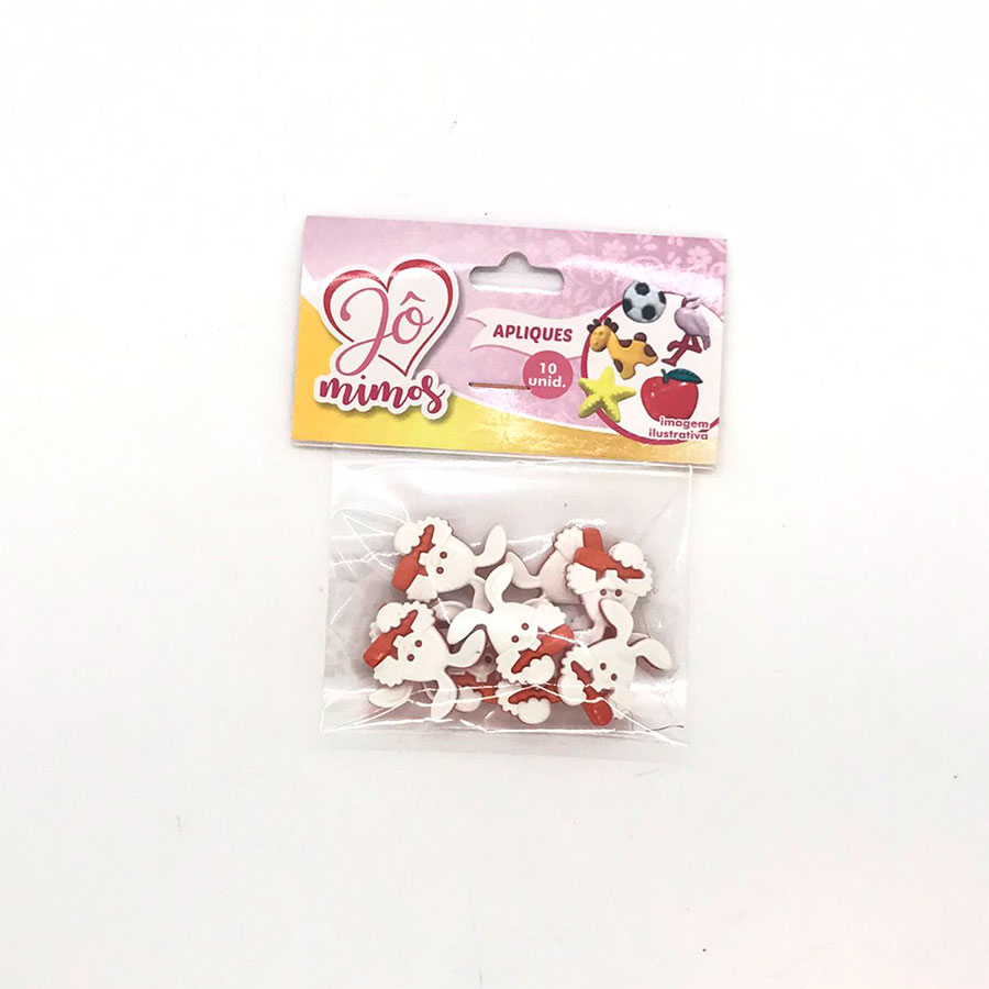 Um pacote de plastico transparente contendo 10 apliques decorativos de coelho comendo cenoura nas cores laranja e branco