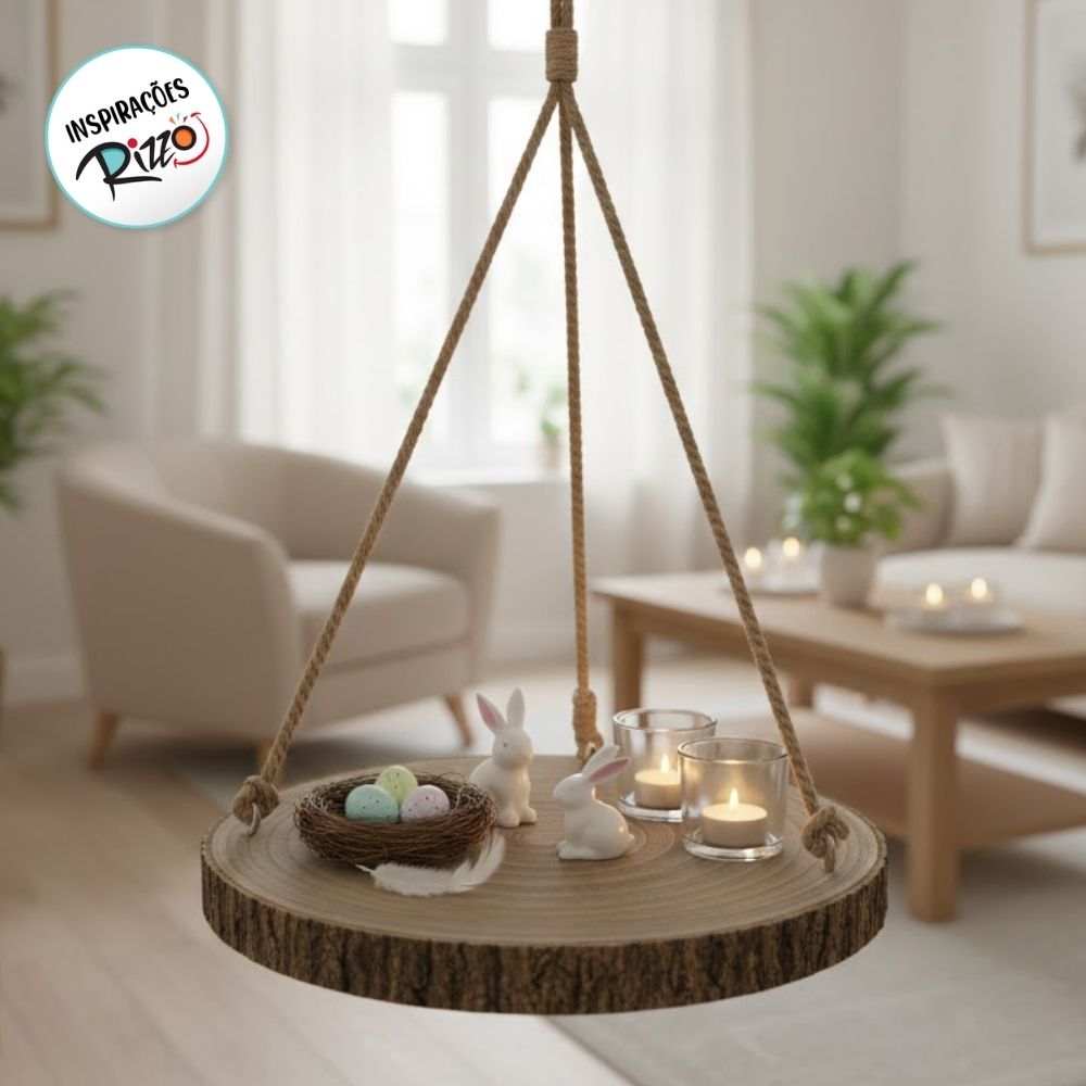 O Enfeite Decorativo de Páscoa tipo balanço rústico de madeira é uma peça decorativa cheia de charme e autenticidade, feita a partir de um tronco de madeira real. A madeira é cortada de forma a criar uma base plana, preservando seus veios, formas irregulares e textura natural. O balanço é suspenso por uma corda grossa, fixada à madeira com detalhes em metal, reforçando o estilo rústico e artesanal da peça.