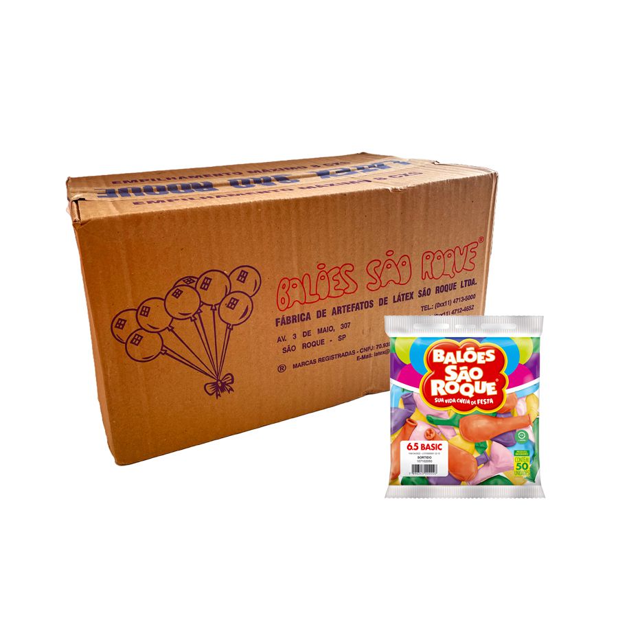 Caixa fechada com 25 pacotes com 50 unidades cada, somando 1250 balões nas cores Sortidas, no tamanho 6,5''.