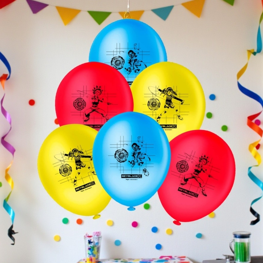 Balão de festa decorativo em látex, 9" (23cm), com estampa temática Beyblade X. Ideal para festas infantis, eventos temáticos e decorações de aniversário, proporcionando destaque e diversão ao ambiente.