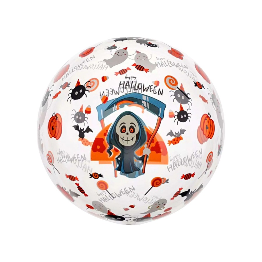 Balão bolha com estampa temática de halloween, com o fundo branco salpicado por itens de halloween, destacando a porte e sua foice