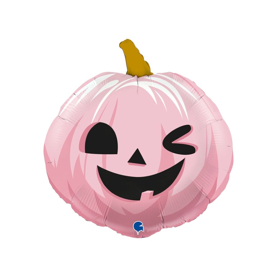 Balão metalizado de 22" (56 cm) com design temático de Halloween, apresentando uma cabeça de abóbora na cor rosa. Ideal para adicionar um toque alegre e único à decoração de sua festa de Halloween, esse balão destaca-se com sua cor vibrante e design cativante.