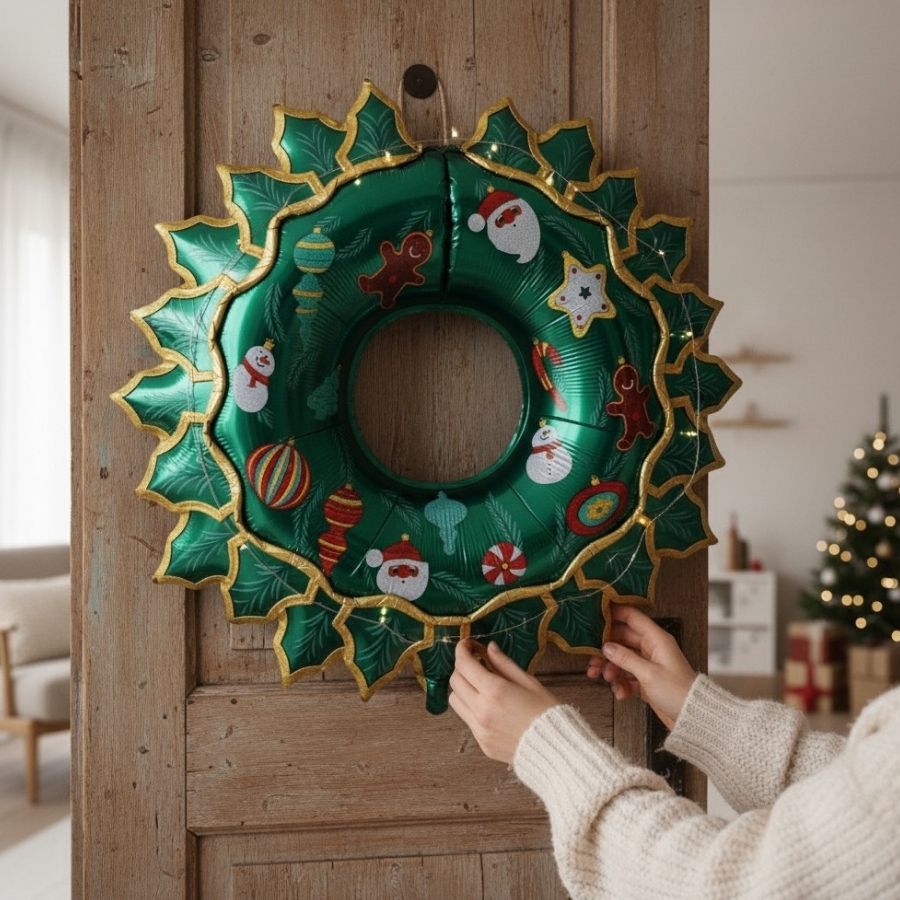 Balão microfoil de 32” com estampa de guirlanda de Natal, ideal para decorações festivas, fotos e ambientações temáticas.