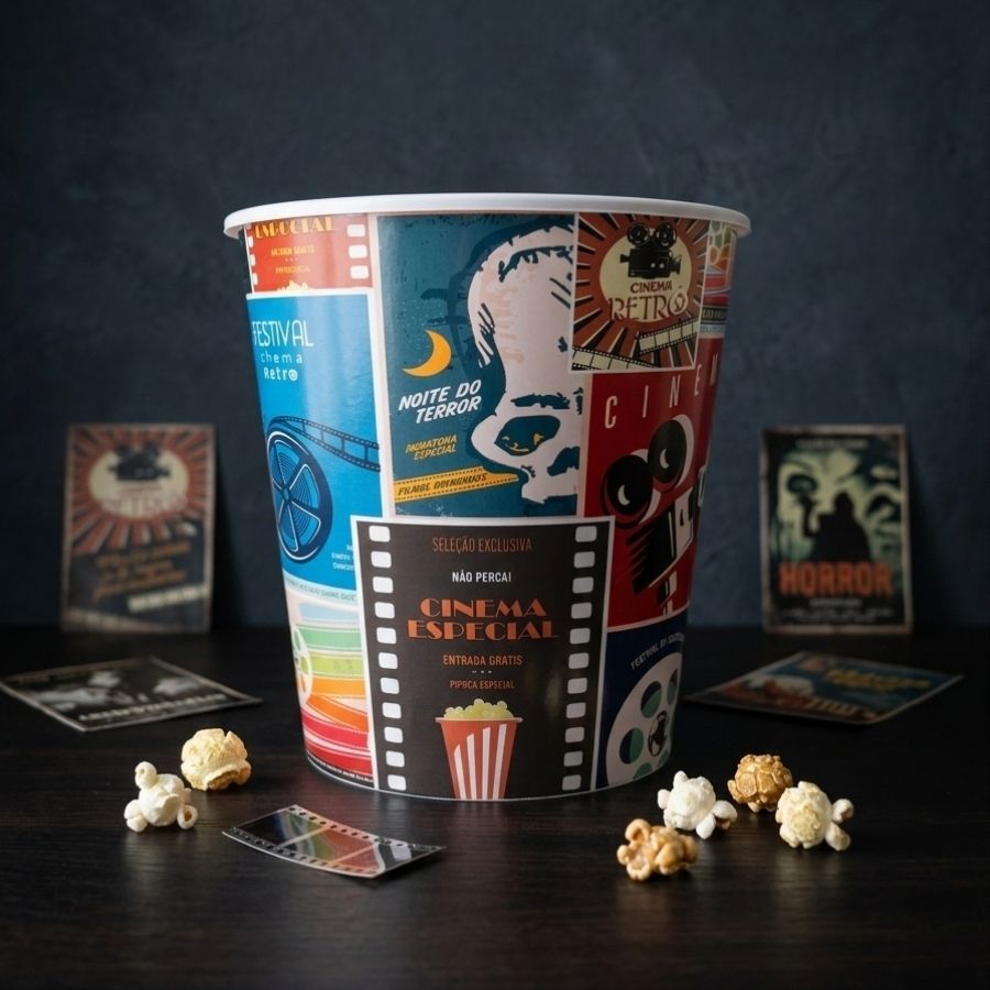 Perfeitos para usar em festas com tema cinema, noite do filme em casa, aniversários, chá de bebê e eventos escolares, os baldes podem ser preenchidos com pipoca doce ou salgada, balas, doces embalados, chocolates e outras delícias. Também funcionam como parte da decoração da mesa principal ou como lembrança personalizada para convidados. Uma dica prática é montar kits cinema, incluindo pipoca, refrigerante e doces, criando uma experiência completa e encantadora. Versáteis, resistentes e cheios de charme, os baldes de pipoca são a escolha ideal para quem deseja unir praticidade, decoração temática e uma apresentação criativa para festas e momentos especiais.
