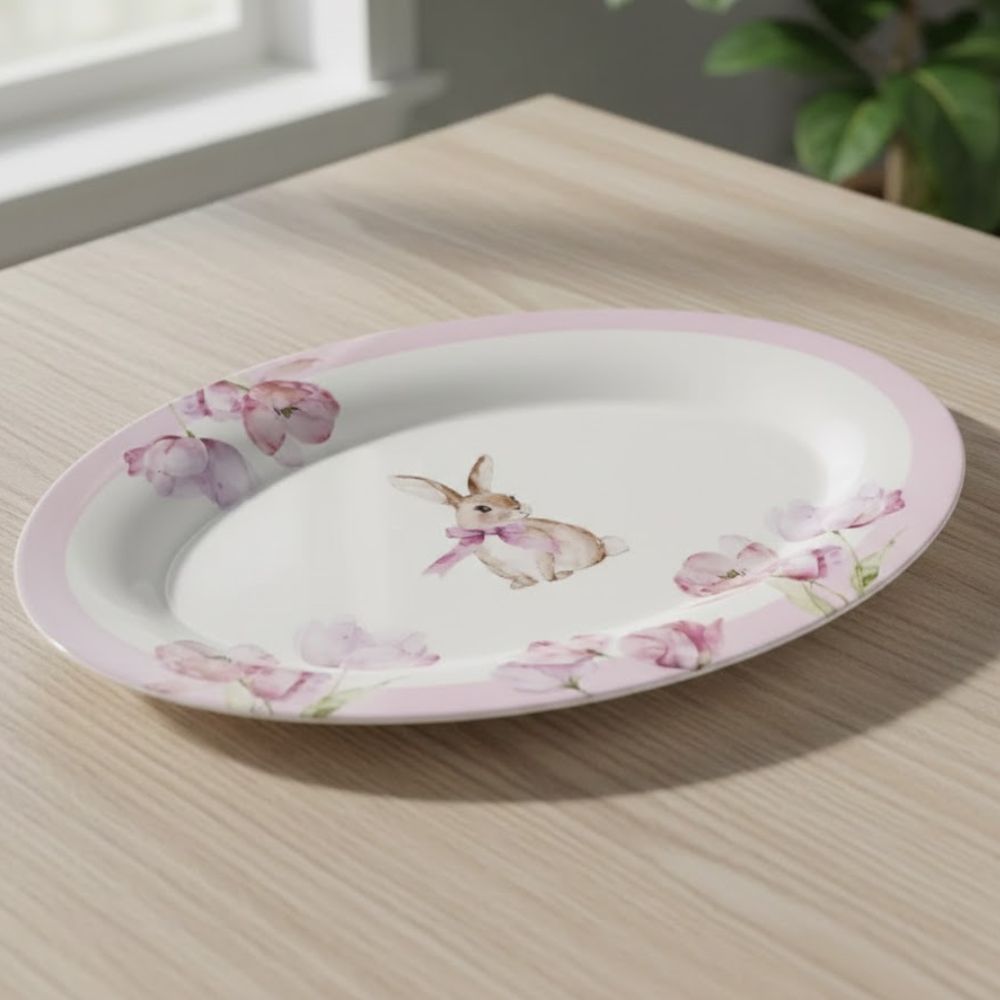 A Bandeja de Melamina é uma peça delicada e temática, perfeita para compor mesas decoradas com charme e suavidade. Decorada com coelho e flores, traz um visual alegre e harmonioso, ideal para a Páscoa ou para quem aprecia itens decorativos com temática floral.