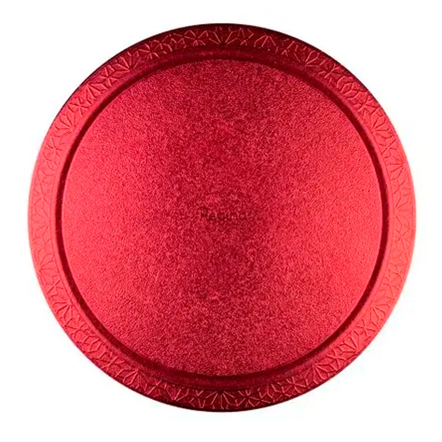 A base para bolo cake board redonda vermelha metalizada de 35cm traz uma cor vibrante que enriquece a decoração da mesa. O acabamento metálico reflete luz e chama a atenção, proporcionando um visual impactante para o bolo