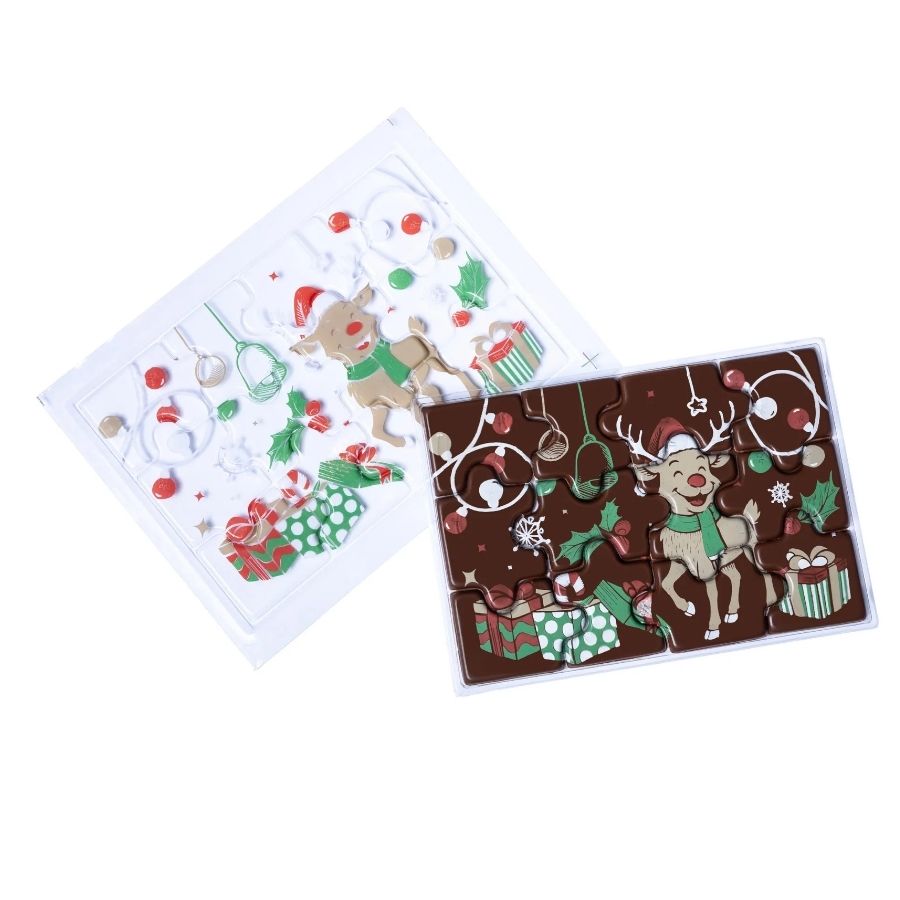 O Blister Decorado com Transfer Para Chocolate - Quebra-Cabeça Luzes - BLN 0201 é perfeito para quem quer produzir chocolates criativos, coloridos e com um toque natalino encantador. O molde possui cavidades em formato de quebra-cabeça, com desenhos temáticos de rena, luzinhas e presentes, que são transferidos diretamente para o chocolate no momento do preparo. O resultado é um chocolate estampado, com visual divertido e acabamento profissional — ideal para lembrancinhas, presentes e produções especiais de Natal.