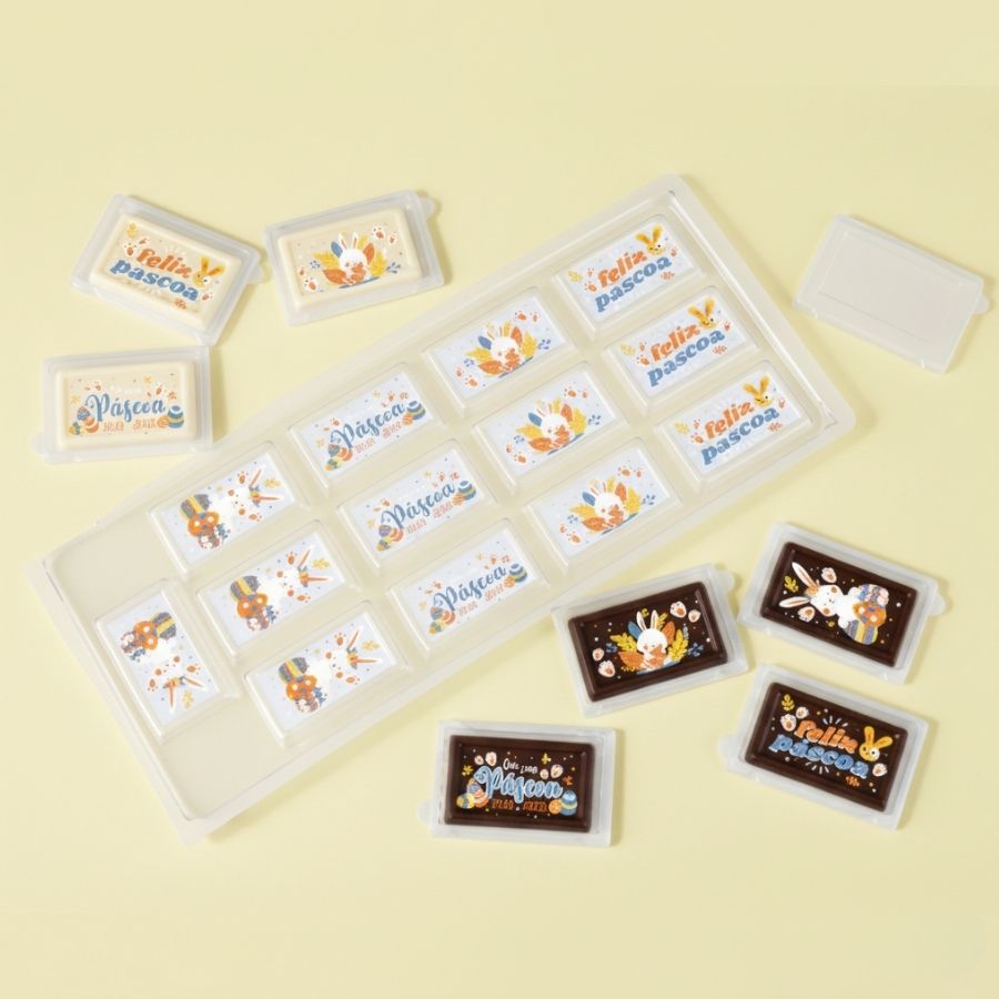 Blister decorativo com transfer para mini tabletes de chocolate de Páscoa, com 13 cavidades e caixas PET inclusas. Ideal para lembrancinhas, chocolates personalizados e vendas sazonais.