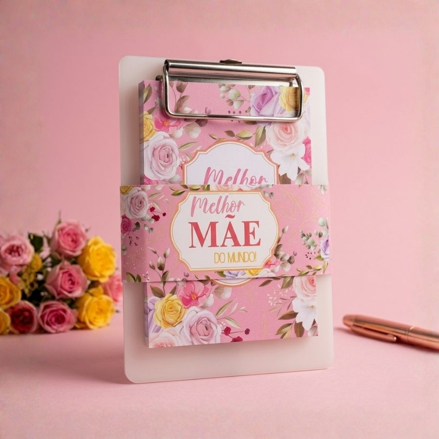 Com medidas de 9,5x13,5cm, o bloco é compacto e fácil de transportar, perfeito para levar na bolsa ou manter sobre a mesa. A prancheta oferece suporte firme para escrever, enquanto a mensagem “Melhor Mãe do Mundo” destaca o valor materno, transformando o presente em um item afetivo e útil no dia a dia.