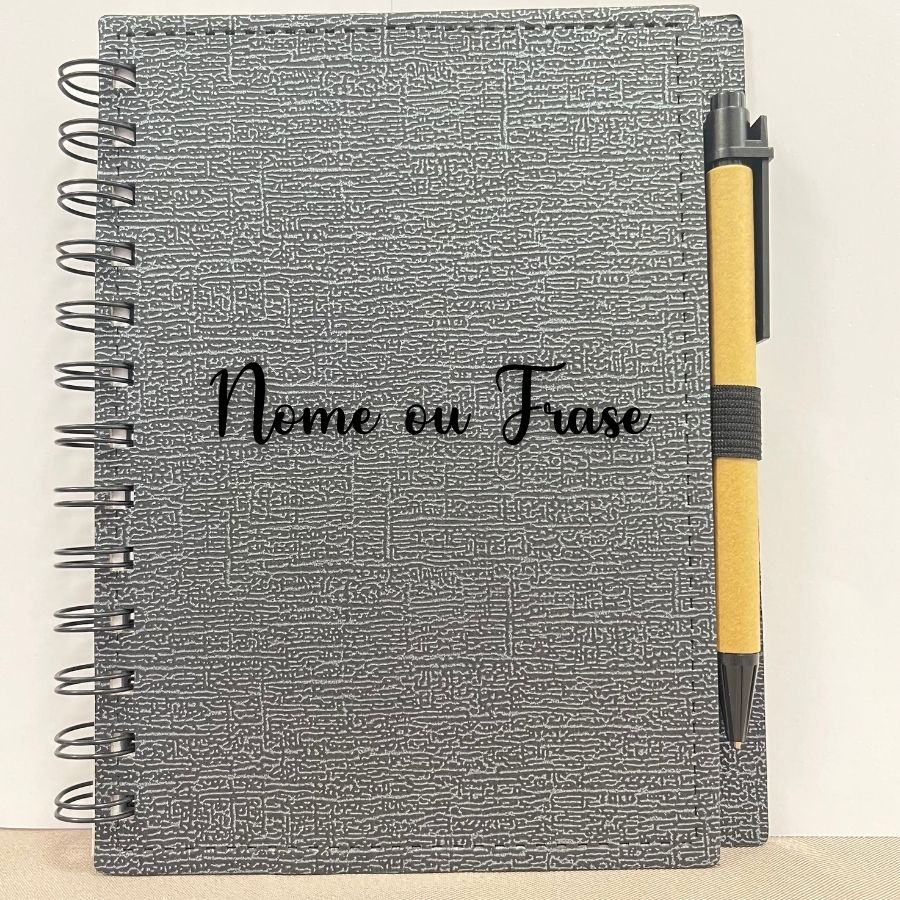 Bloco em couro com personalização preta, 70 folhas e caneta inclusa. Um presente funcional com toque de requinte.