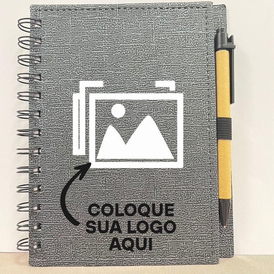 Está disponível nas cores preto com prata, preto com dourado, laranja e amarelo, com acabamento em couro sintético e caneta inclusa. A personalização com LOGO branco destaca sua marca com elegância e clareza.