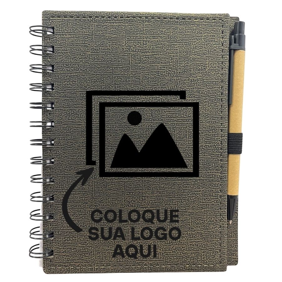 Bloco com LOGO preto, 70 folhas, acabamento em couro e caneta. Um brinde útil e com visual refinado.