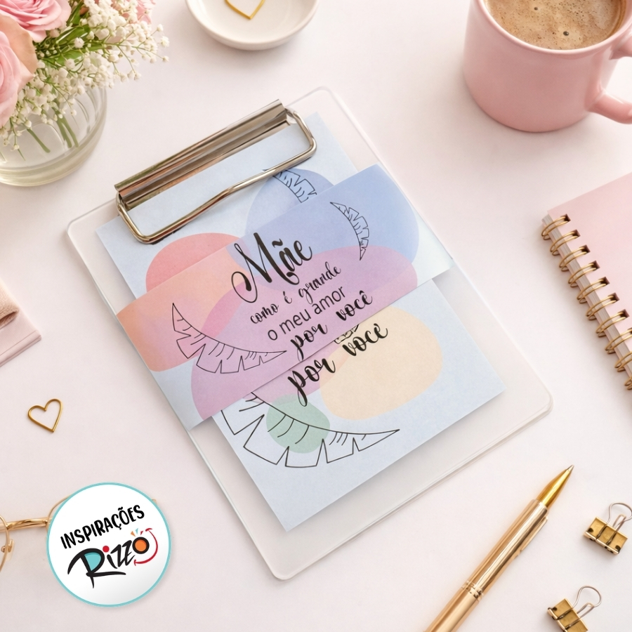Um mini bloco para anotações com prancheta, acompanhado por uma cinta de papel cartão com a mensagem "Mãe Como é Grande o Meu Amor Por Você", seria um presente tocante e significativo para expressar os sentimentos profundos de amor pela mãe. O bloco para anotações ofereceria um espaço prático para fazer anotações, escrever mensagens especiais ou fazer listas, enquanto a prancheta forneceria um suporte estável para escrever em qualquer lugar.