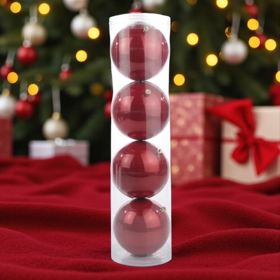 Trata-se de um conjunto de bolas de Natal vermelhas lisas, embaladas em tubo, com diâmetro de 12cm cada. Resistentes, leves e fáceis de pendurar, são ideais para criar decorações natalinas sofisticadas e práticas.