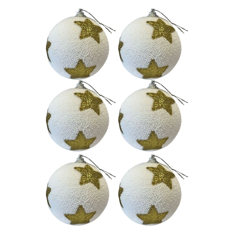 As Bolas de Natal - Estrelas Douradas - 8x8x8cm são um conjunto de 6 unidades encantadoras, ideais para compor a decoração da sua árvore de Natal ou arranjos festivos. Cada bola é branca com apliques de estrelas douradas, trazendo elegância e brilho à sua decoração, criando um efeito sofisticado e alegre.