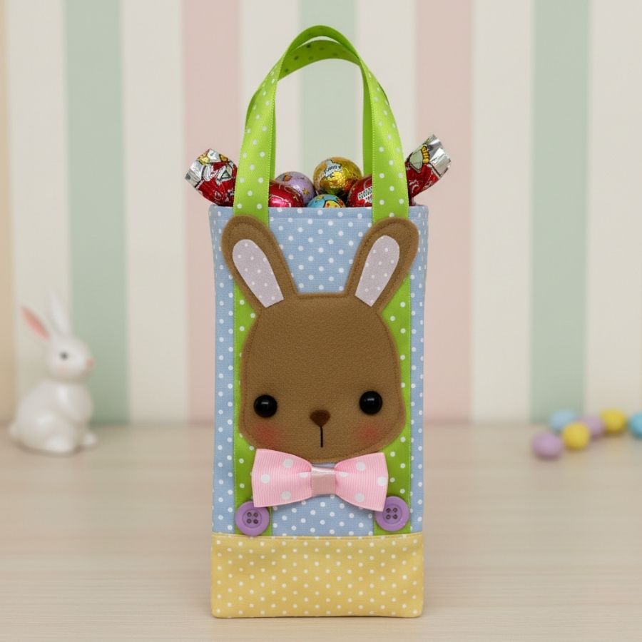Bolsinha artesanal coberto de com pontos brancos e design de coelho em feltro usando macacão amarelo, gravata rosa, camisa azul e suspensórios verdes, os suspensórios viram alça para a bolsa