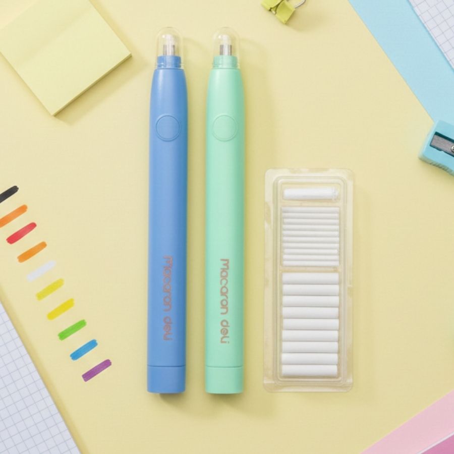 A Borracha Caneta Elétrica Macaron é prática, precisa e fácil de usar, com duas opções de diâmetro para apagamento personalizado, enviada em uma unidade com cor sortida (azul ou verde), ideal para correções detalhadas em estudos, desenhos e trabalhos técnicos.