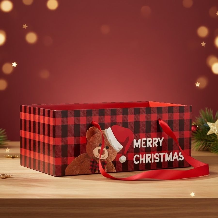 Cachepot retangular temático Teddy Noel com alça de cetim, ideal para presentes, organização e decoração natalina.
