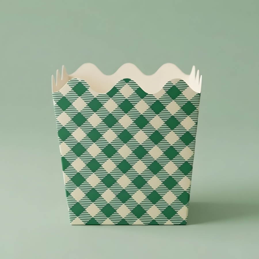 Cachepot fabricado em papel com estampa xadrez nas cores branco e verde. Possui dimensões aproximadas de 9,5x9x9,5cm. Indicado para uso decorativo ou para acomodar itens leves, como doces e pequenos objetos. Produto não indicado para contato com líquidos. Recomenda-se evitar umidade para preservar a estrutura do material.