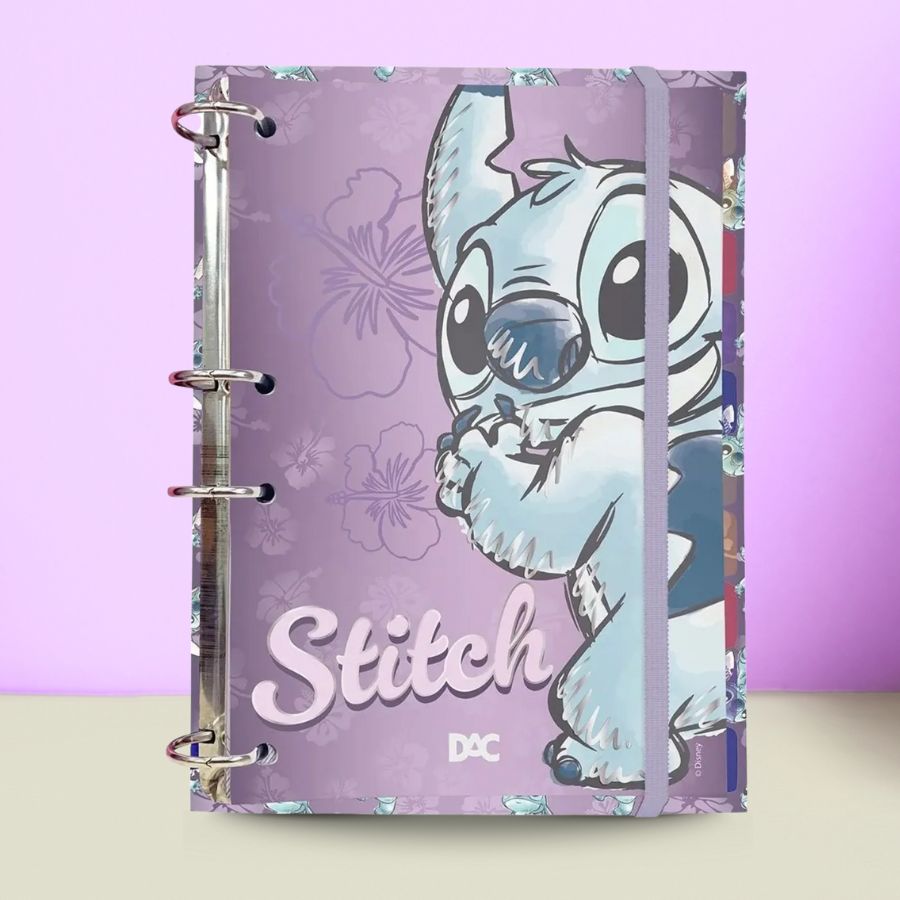 Caderno argolado com 144 folhas decoradas inspiradas em Stitch Disney e 10 divisórias plasticas coloridas.