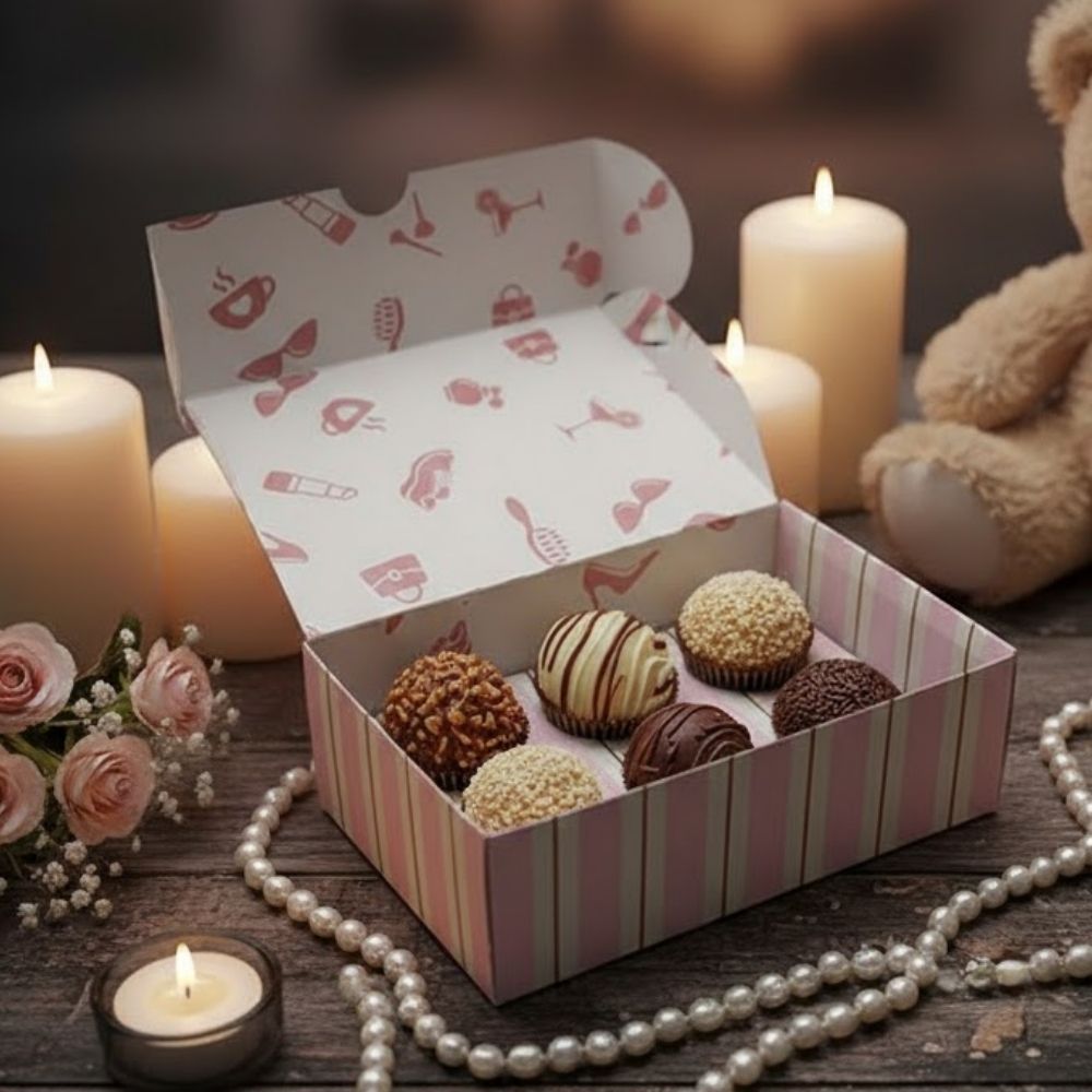 Com aproximadamente 13x9x4,5cm, possui tamanho ideal para acomodar até 6 doces, como brigadeiros, trufas ou bombons. Seu formato retangular valoriza a organização interna e garante uma apresentação elegante e harmoniosa.