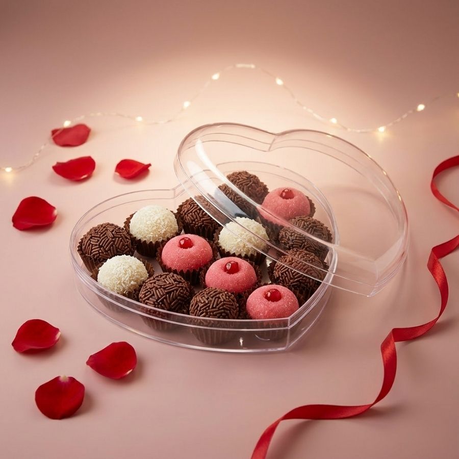 Caixa Acrílica Coração Transparente de 16,8 x 15 x 4,5 cm, perfeita para presentear com chocolates, doces ou pequenos itens. Ideal para datas especiais e kits personalizados, combina charme, praticidade e sofisticação.