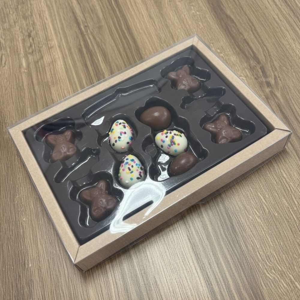 Distribua os chocolates temáticos nas cavidades correspondentes, explorando a variedade de formatos. Finalize com tags personalizadas, fitas ou elementos naturais para reforçar a proposta artesanal da embalagem.