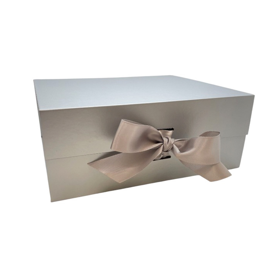 Caixa de Papel Rígido Dobrável com ímã e Fita de Cetim na cor Prata