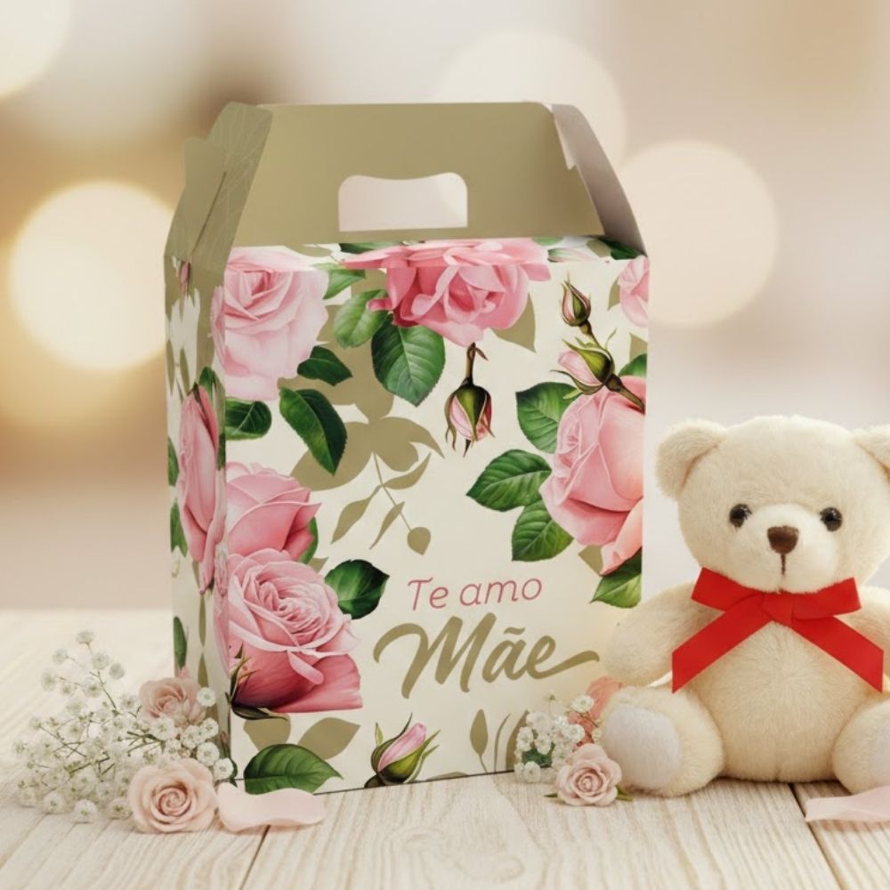A Caixa Maleta Retangular Mãe Clássica é perfeita para montar presentes sofisticados com praticidade e charme. Com estrutura firme, ela se transforma em uma maletinha resistente, garantindo segurança no transporte e uma apresentação elegante. A linha Mãe Clássica mantém sua identidade delicada com base em verde, estampa de rosas cor-de-rosa e fundo em branco off-white, criando um visual romântico e atemporal.