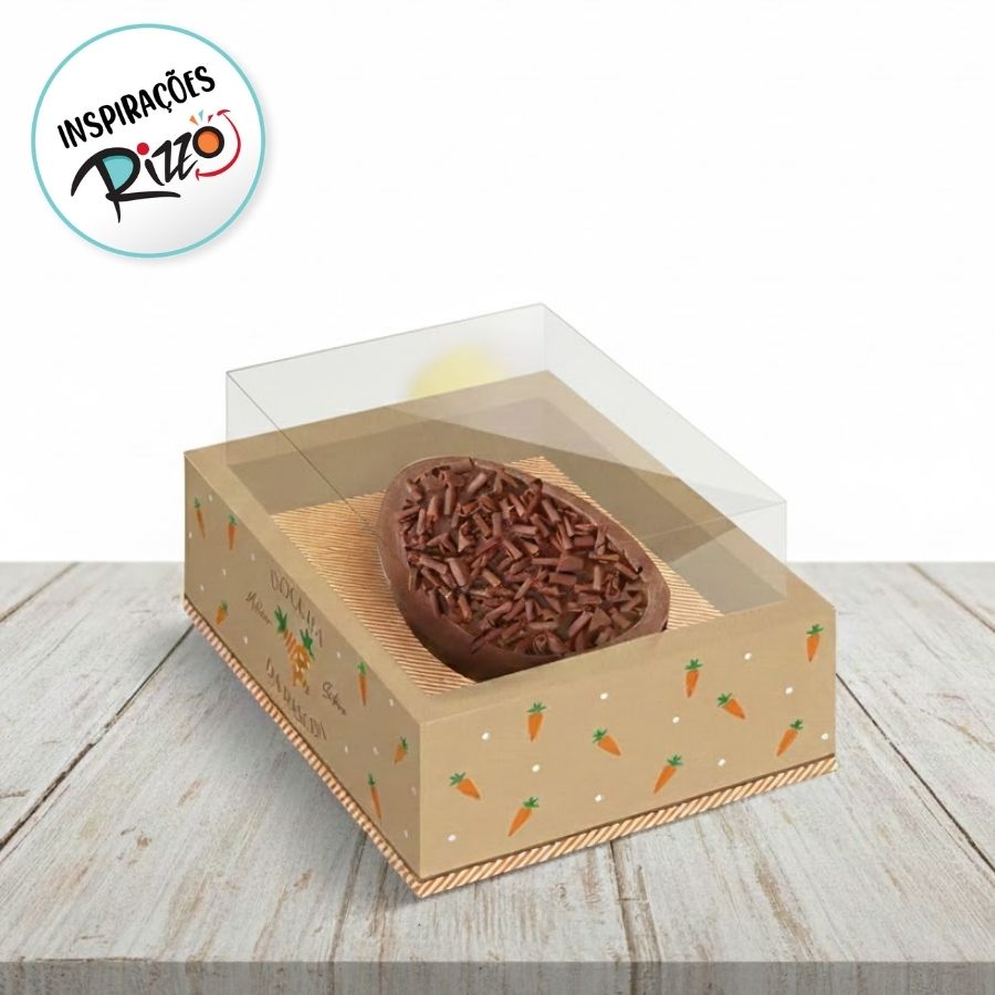 A Caixa New Moldura para Meio Ovo de 250g - Kraft Cenoura é resistente, prática e realça o produto com uma moldura temática em kraft cenoura.