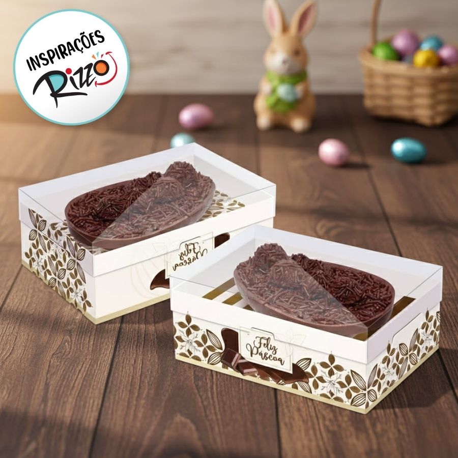 A Caixa New Practice com Regulagem de Altura para Meio Ovo de 250g Flor de Cacau Marfim Sortido é uma embalagem decorativa, resistente e prática, perfeita para destacar ovos artesanais com organização, delicadeza e apresentação impecável.