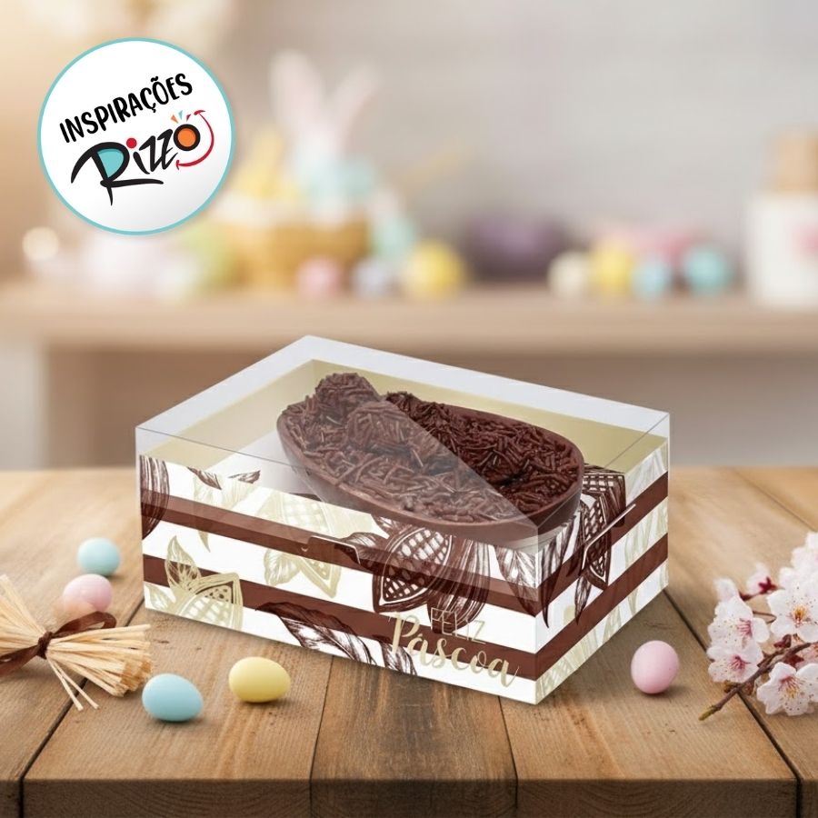 Produzida em material resistente, essa caixa é ideal para confeiteiros e chocolaterias que buscam praticidade sem abrir mão da estética. O espaço para a colher torna o consumo mais prático e o acabamento elegante transforma a embalagem em uma excelente opção para presentear na Páscoa ou em datas especiais.