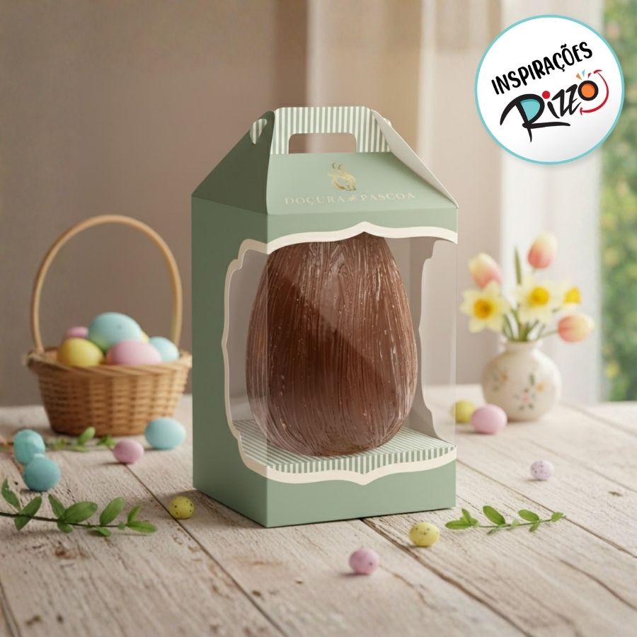 A Caixa New Practice para Meio Ovo de 350g é moderna, resistente e sofisticada, com acabamento em sálvia que valoriza o produto e facilita a apresentação.