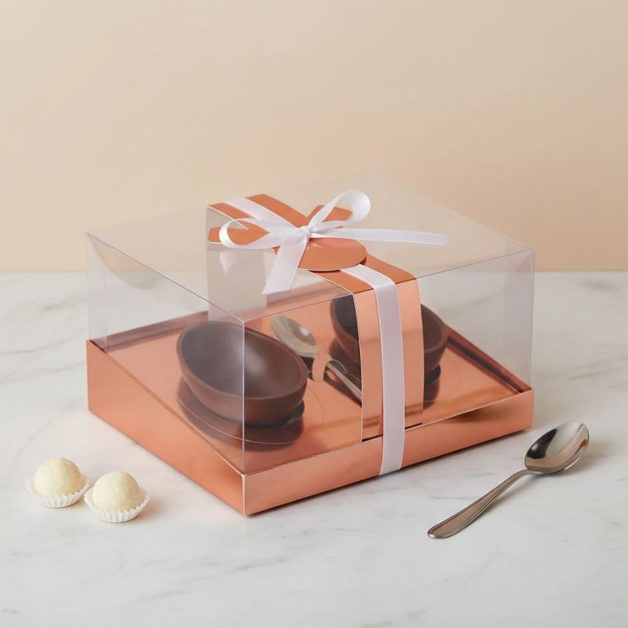 Caixa para 2 meio ovos de colher, com tampa de acetato, e a caixa rose metalico, com berço regulavel para 2 cascas de 150g, 250g ou 350g