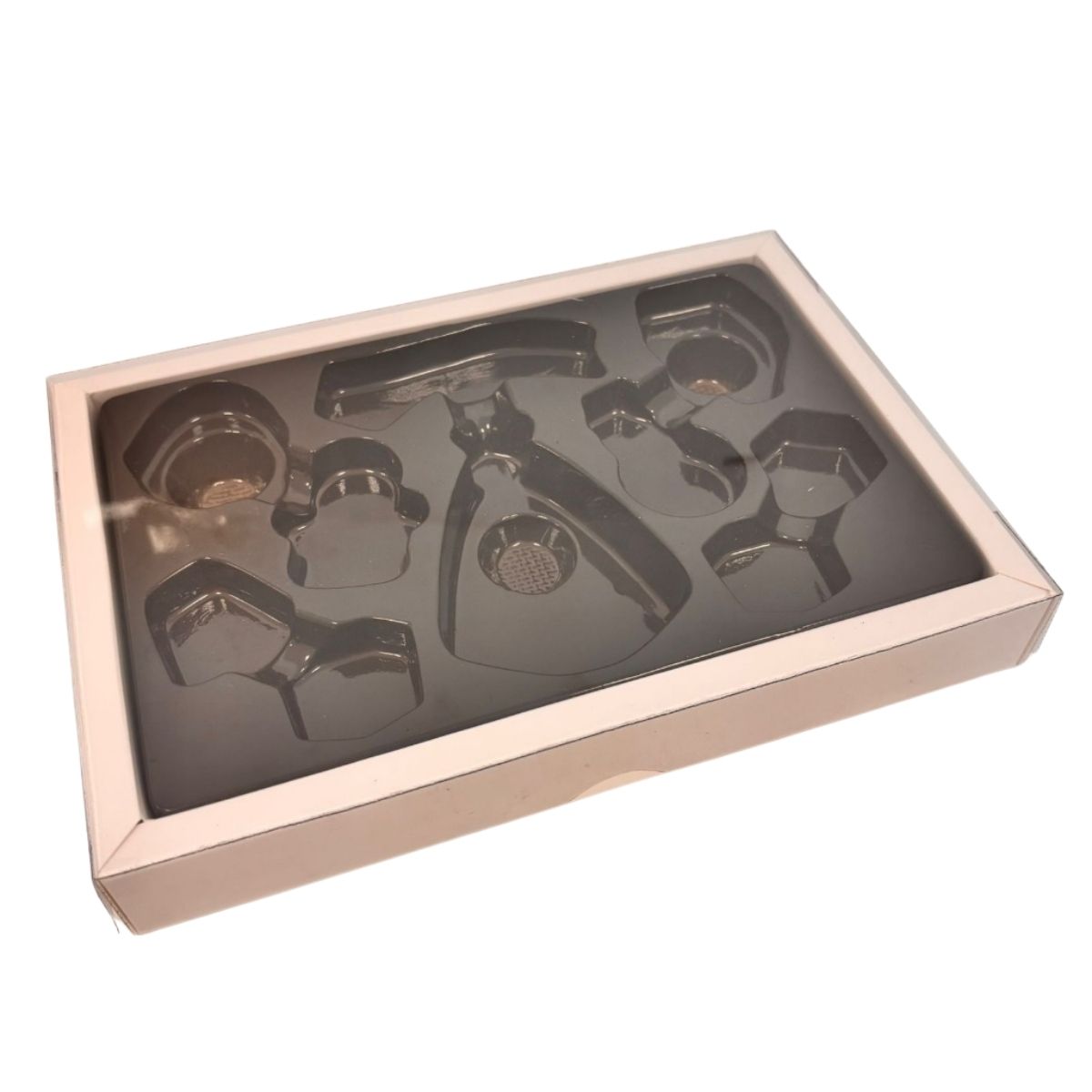 Após moldar as trufas utilizando a forma Ref. 6024, posicione-as nas cavidades da caixa, encaixe a tampa plástica e finalize com o envoltório branco. Se desejar, adicione fitas, adesivos ou tags personalizadas para deixar o presente ainda mais especial. Armazene em local fresco e seco, longe da luz solar direta.
