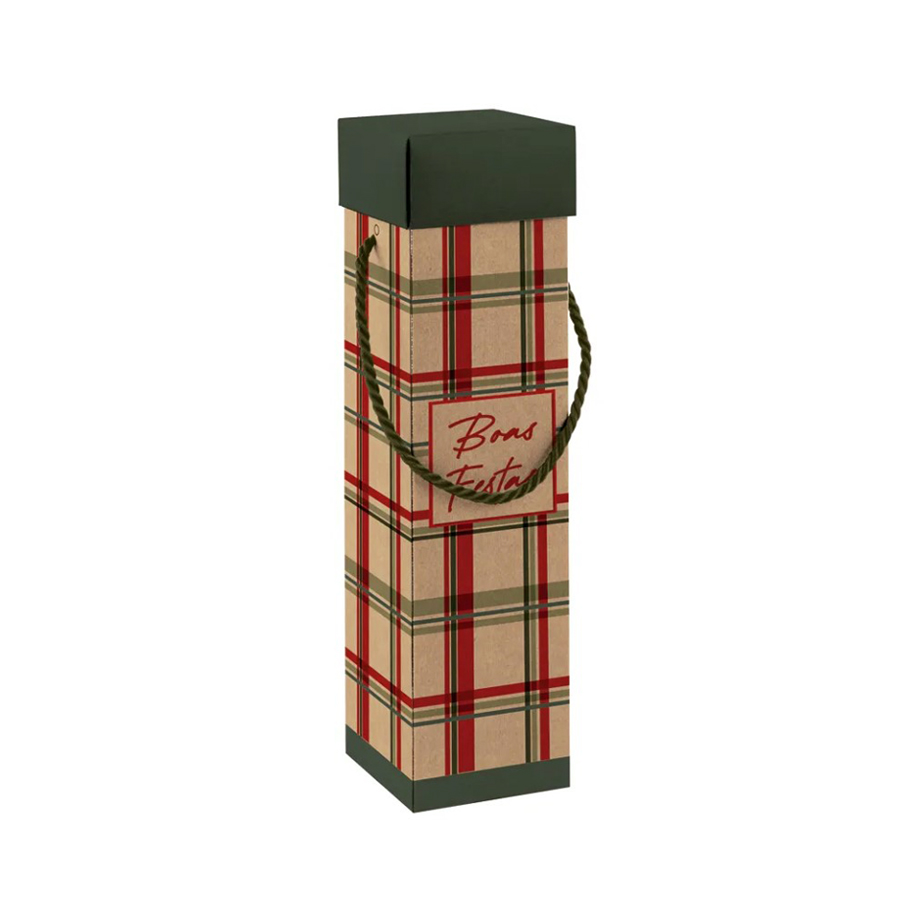 Caixa de Papel para Garrafa com alça, na cor Kraft com xadrez verde e vermelho, tampa verde escuro e alça verde.