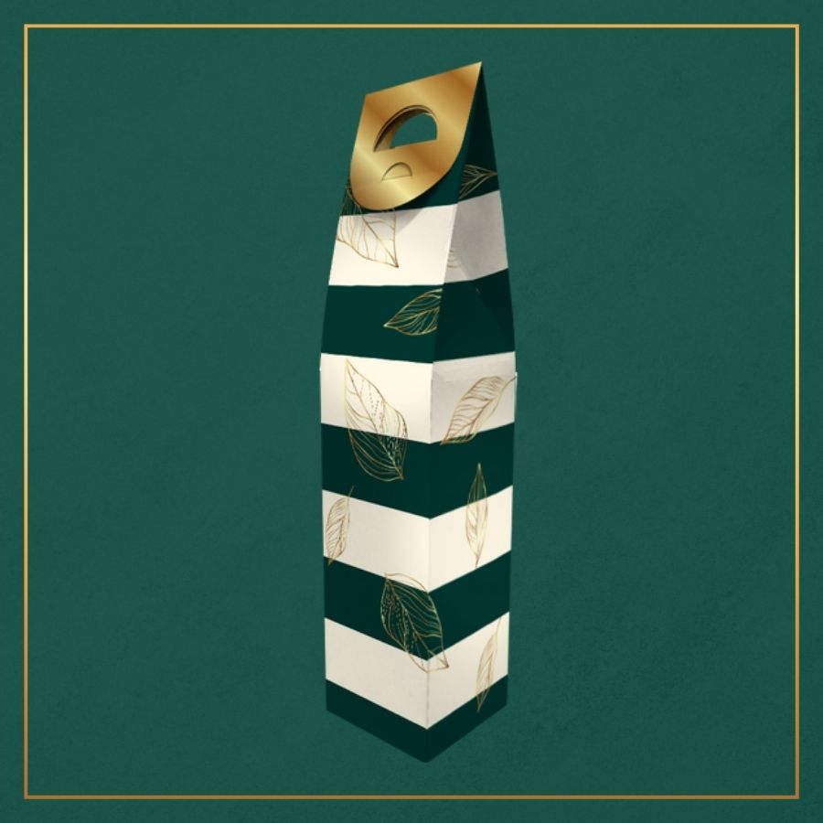 Sofisticada e cheia de personalidade, a Caixa para Presente Garrafa Verde com Folhagem Dourada transforma a entrega de uma bebida em um gesto elegante e memorável. A combinação do verde profundo com detalhes em folhagem dourada transmite requinte, exclusividade e celebração, valorizando o presente desde o primeiro olhar e criando uma experiência visual premium.