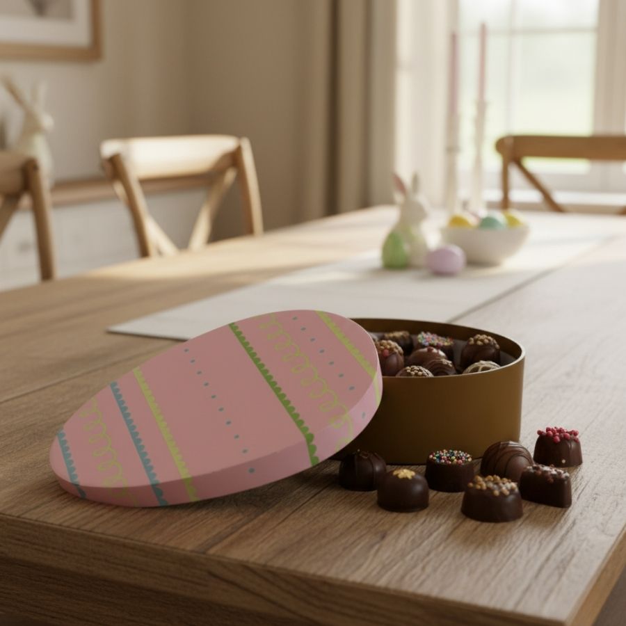 Esta caixa de Páscoa alia praticidade e charme, sendo fácil de montar e decorar. A tonalidade rosa e o formato de ovo de Páscoa conferem delicadeza e sofisticação, valorizando a apresentação de chocolates e lembrancinhas artesanais. Ideal para pequenos produtores, confeiteiros e artesãos que desejam criar embalagens personalizadas e atrativas, agregando valor visual e profissionalismo às suas produções.