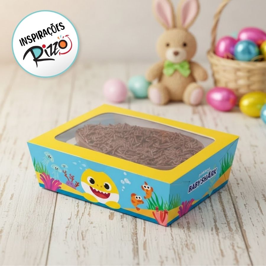 Produzida em material resistente, a Caixa Practice Baby Shark garante segurança e firmeza para o meio ovo de 350g, além de praticidade na montagem. Seu formato funcional permite personalizações com laços, fitas, tags e adesivos, agregando ainda mais valor ao produto final. É uma excelente opção para confeiteiros, chocolaterias e lojistas que buscam uma embalagem criativa, atrativa e com ótimo custo-benefício.