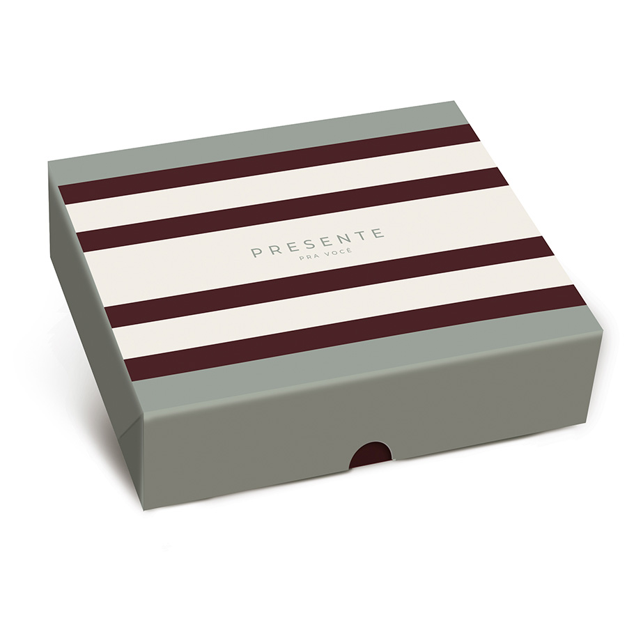 Caixa retangular com tampa new land escrito "presente para você" nas cores verde, marrom e branco
